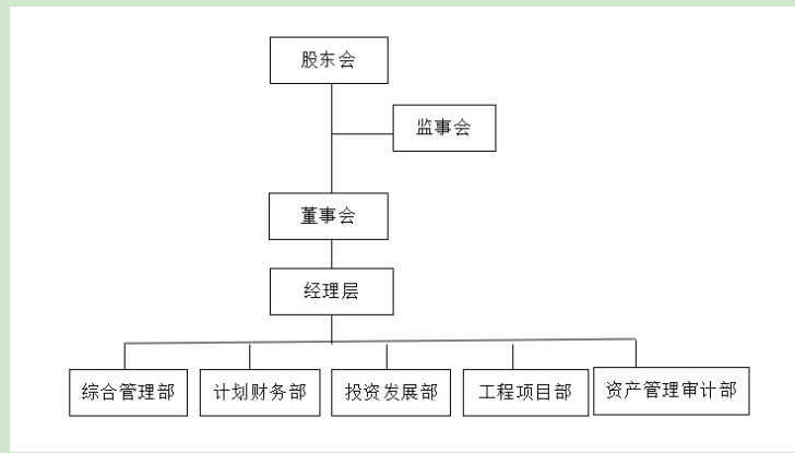 根據(jù)公司組建方案,公司目前設(shè)立了綜合管理部、計(jì)劃財(cái)務(wù)部、投資發(fā)展部、工程項(xiàng)目部、資產(chǎn)管理審計(jì)部5個(gè)部門(mén)。隨著公司的不斷發(fā)展,組織結(jié)構(gòu)設(shè)計(jì)也將會(huì)不斷進(jìn)行改革和完善。公司依法依規(guī)成了黨支部、工會(huì)、團(tuán)組織和婦聯(lián)組織。